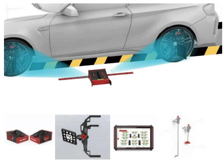 Aparatul este compus din 2 unitati de masura , 4 tinte ce se prind pe roti si o tableta.